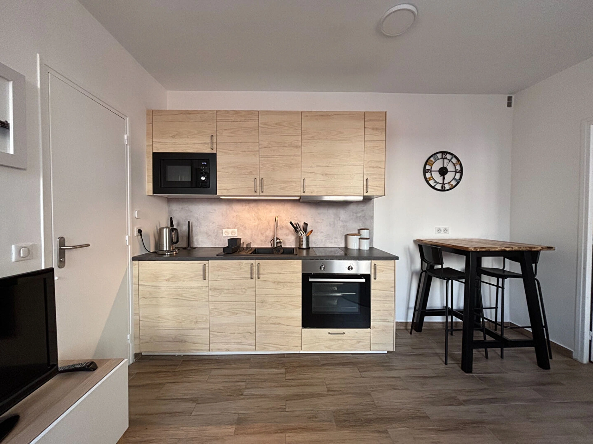 Ce bien comprend une pièce à vivre lumineuse et sans vis à vis avec cuisine ouverte entièrement équipée. Une chambre avec penderie et lit double.