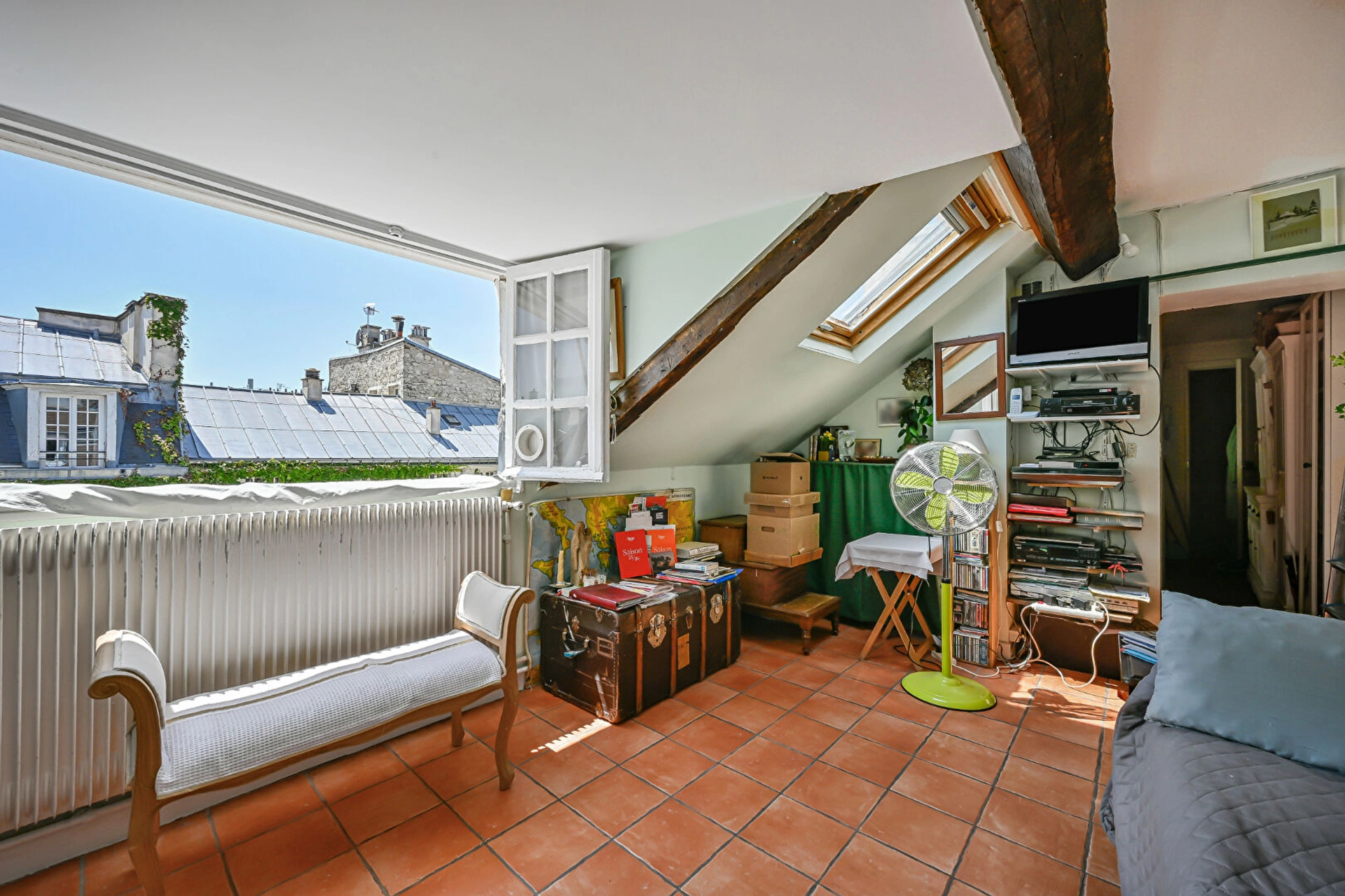 Emplacement exceptionnel au dernier étage - Magnifique immeuble 1750 avec escalier inscrit aux monuments historiques - Gardien. Découvrez ce bel appartement au calme absolu et exposé plein sud. Le bien se compose d'une entrée avec rangements, d'un escalier privatif qui donne accès à une salle à manger avec cuisine, d'une pièce de vie, d'une chambre et d'une salle d'eau avec WC.