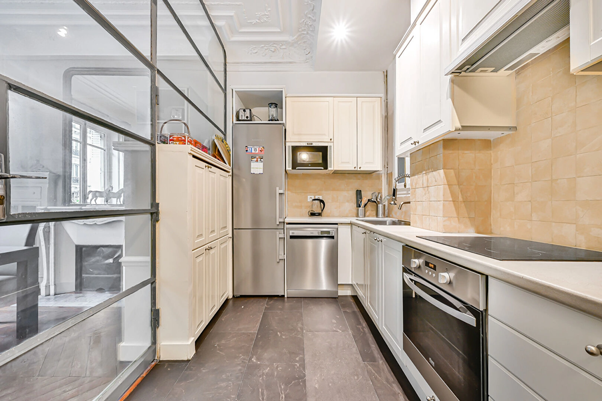 S'ensuit la salle à manger également pourvue d'une belle cheminée - et sa cuisine qui a été séparée par une verrière structure métal, pensée par architecte.
