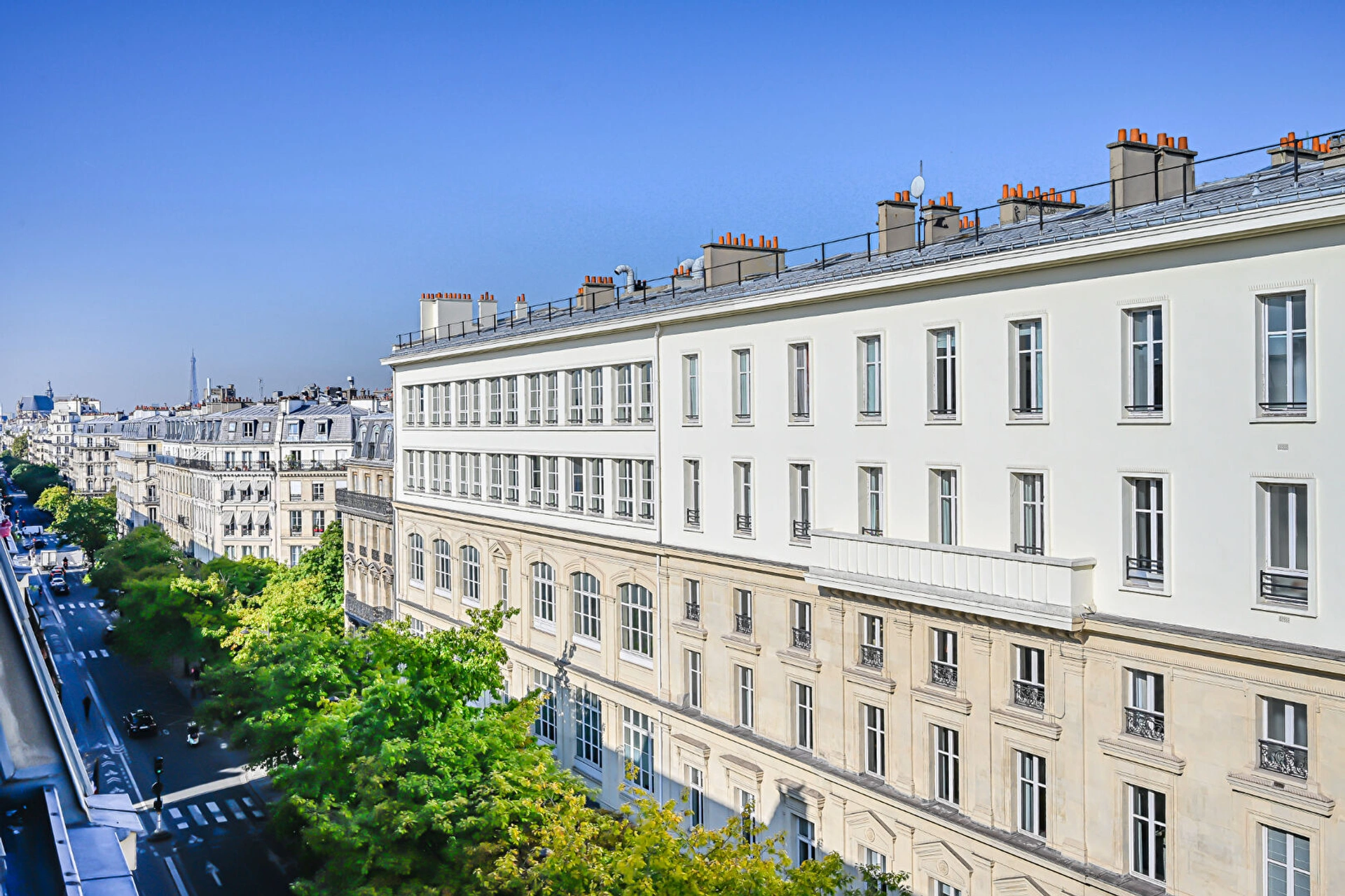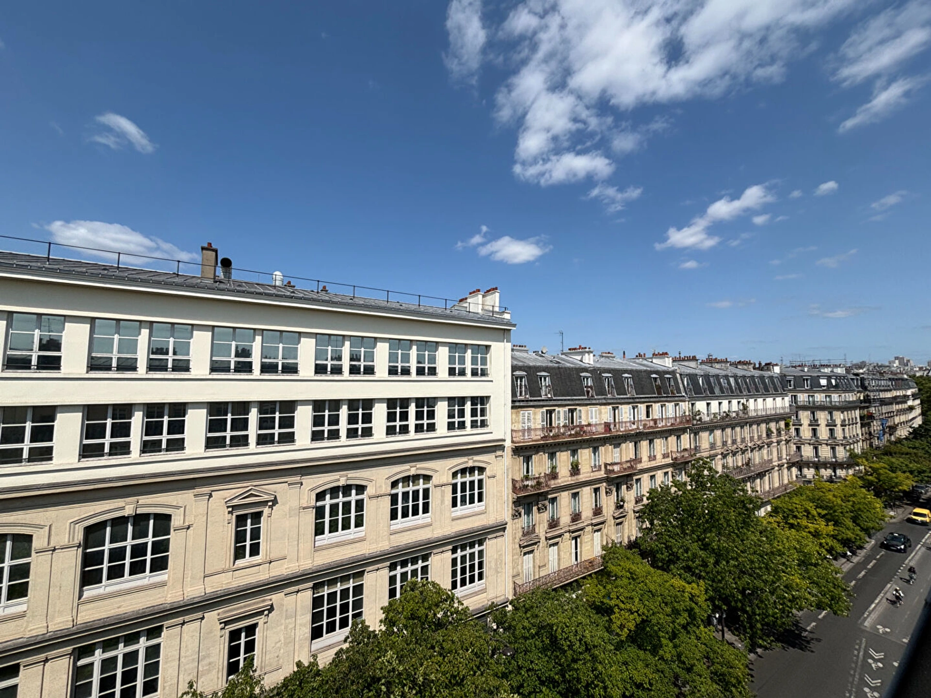 The apartment features a sunny living area 18m2, an open kitchen, a bedroom of 9,5m2 (currently being renovated - photo is a projection), and a modern bathroom with toilet. Enjoy the Paris skyline from three bigs windows